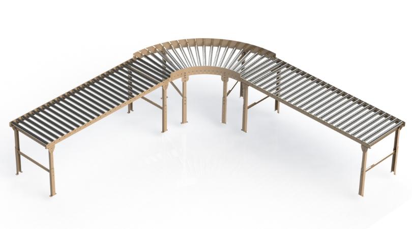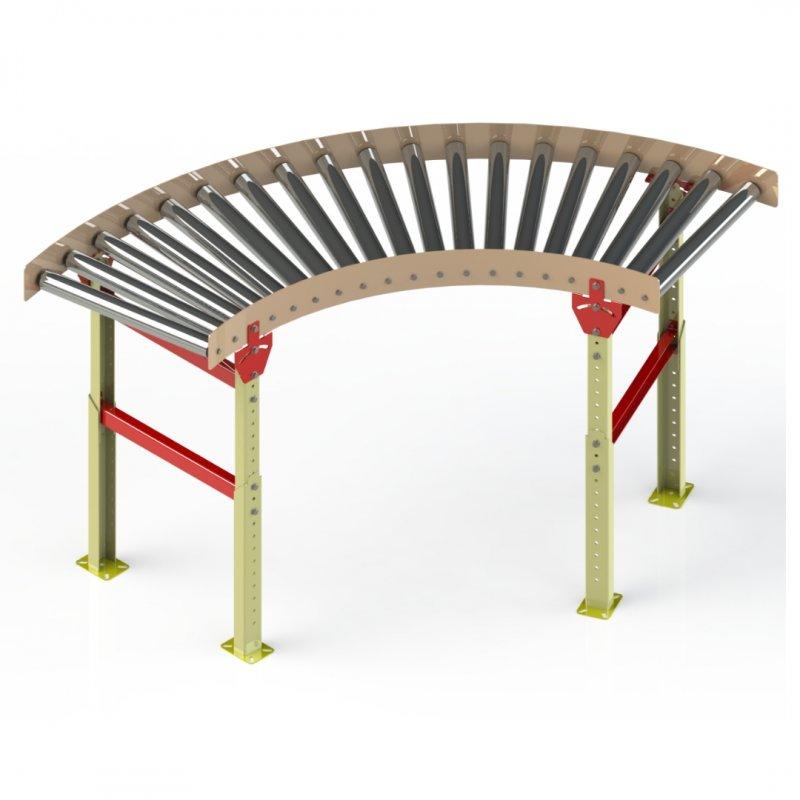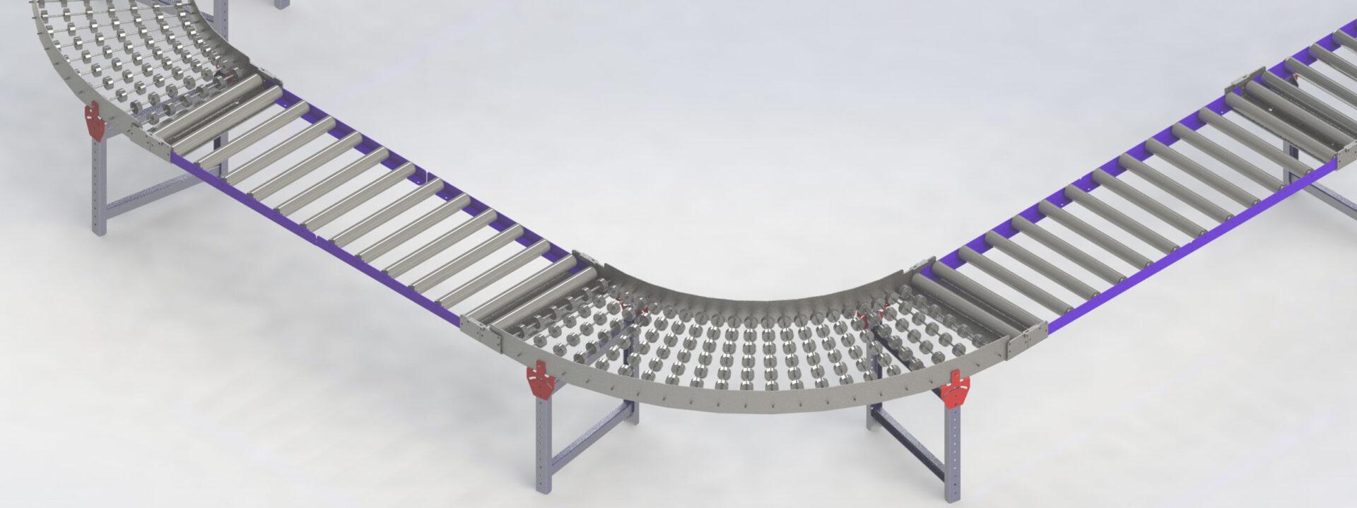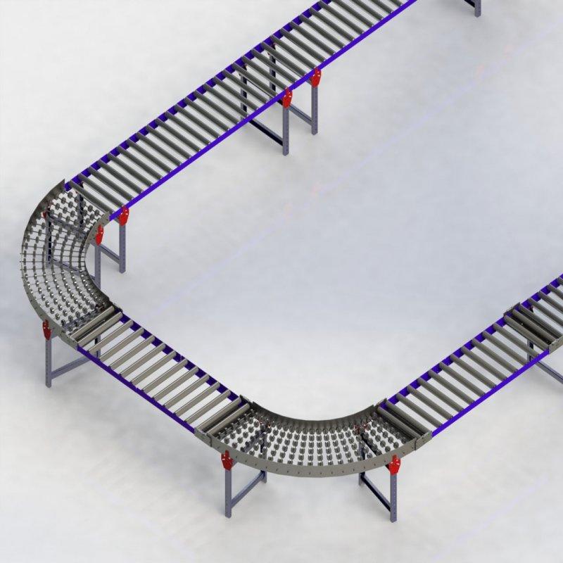 Podem ser fabricadas Esteiras de Roletes Livres em curvas para ser acoplada em diversos layouts.